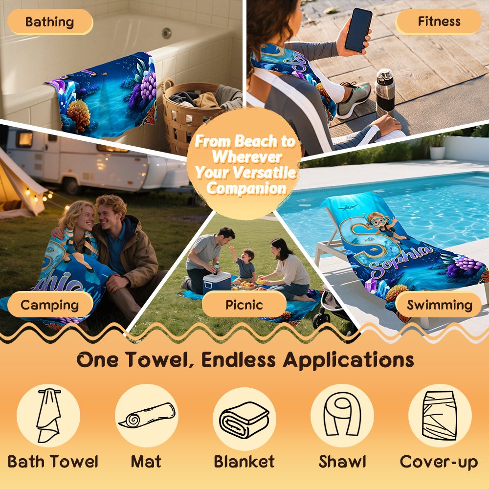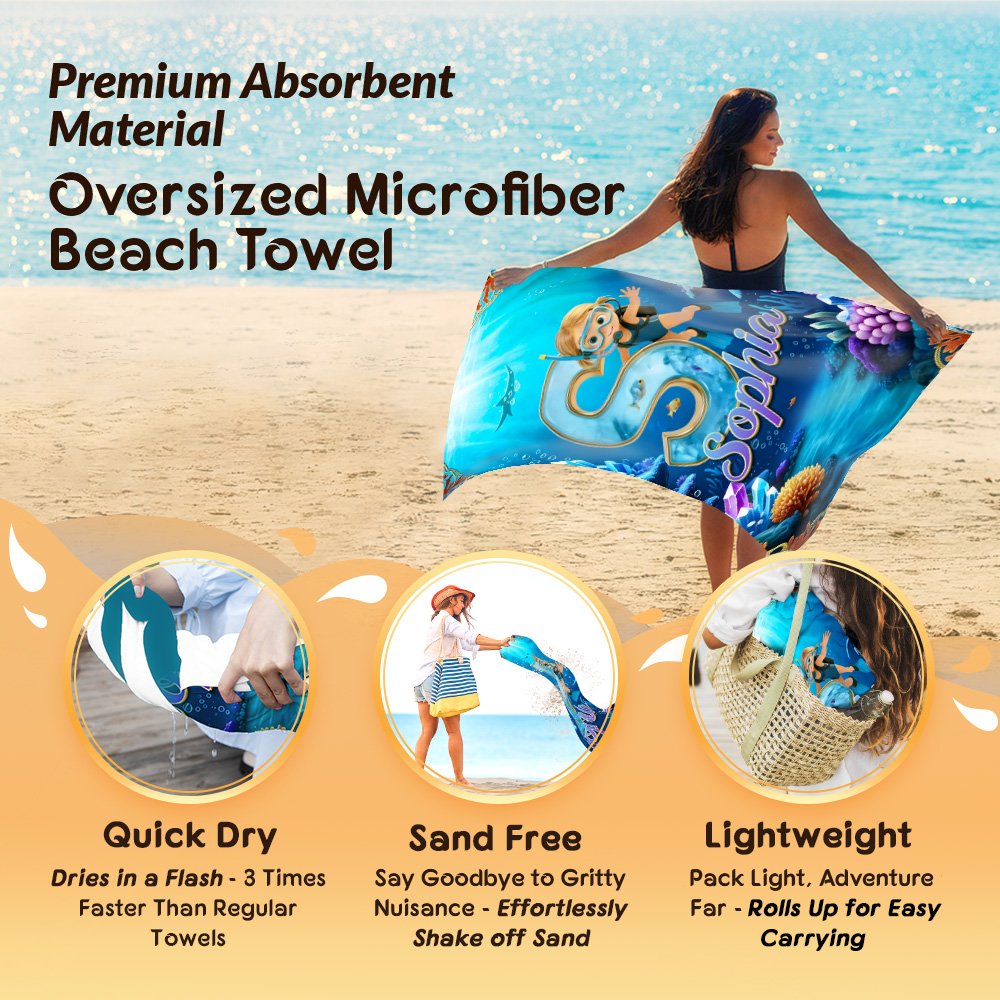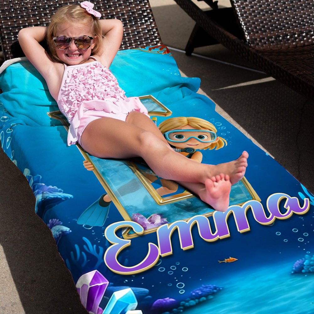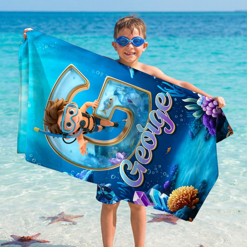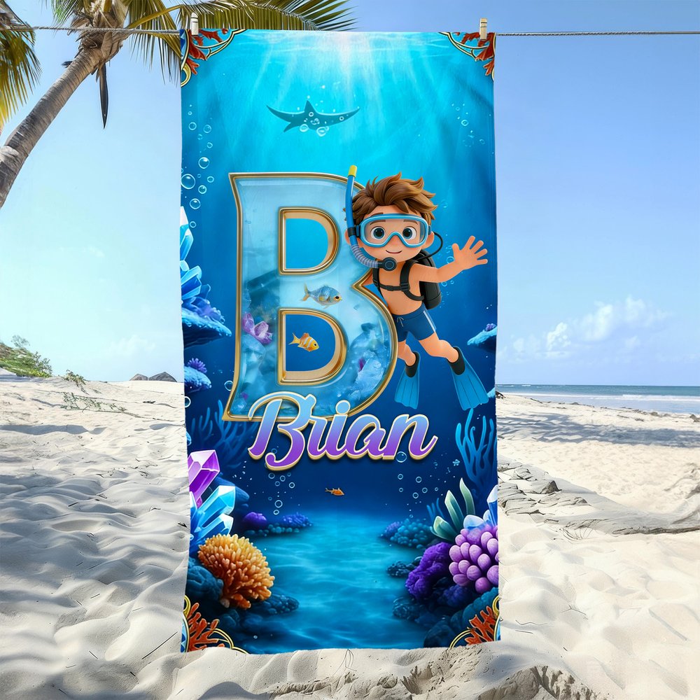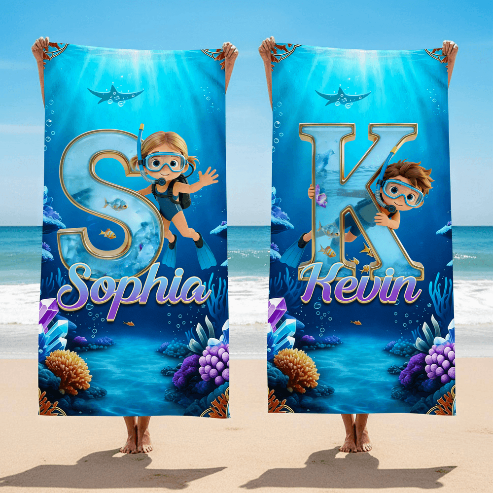 This beach towel features a cartoon diving boy and girl character and can be customized with your kid's initial and name. It is paired with a deep blue underwater scene with marine elements such as coral, small fish, and bubbles, creating a wonderful atmosphere that perfectly captures children's yearning for ocean exploration.