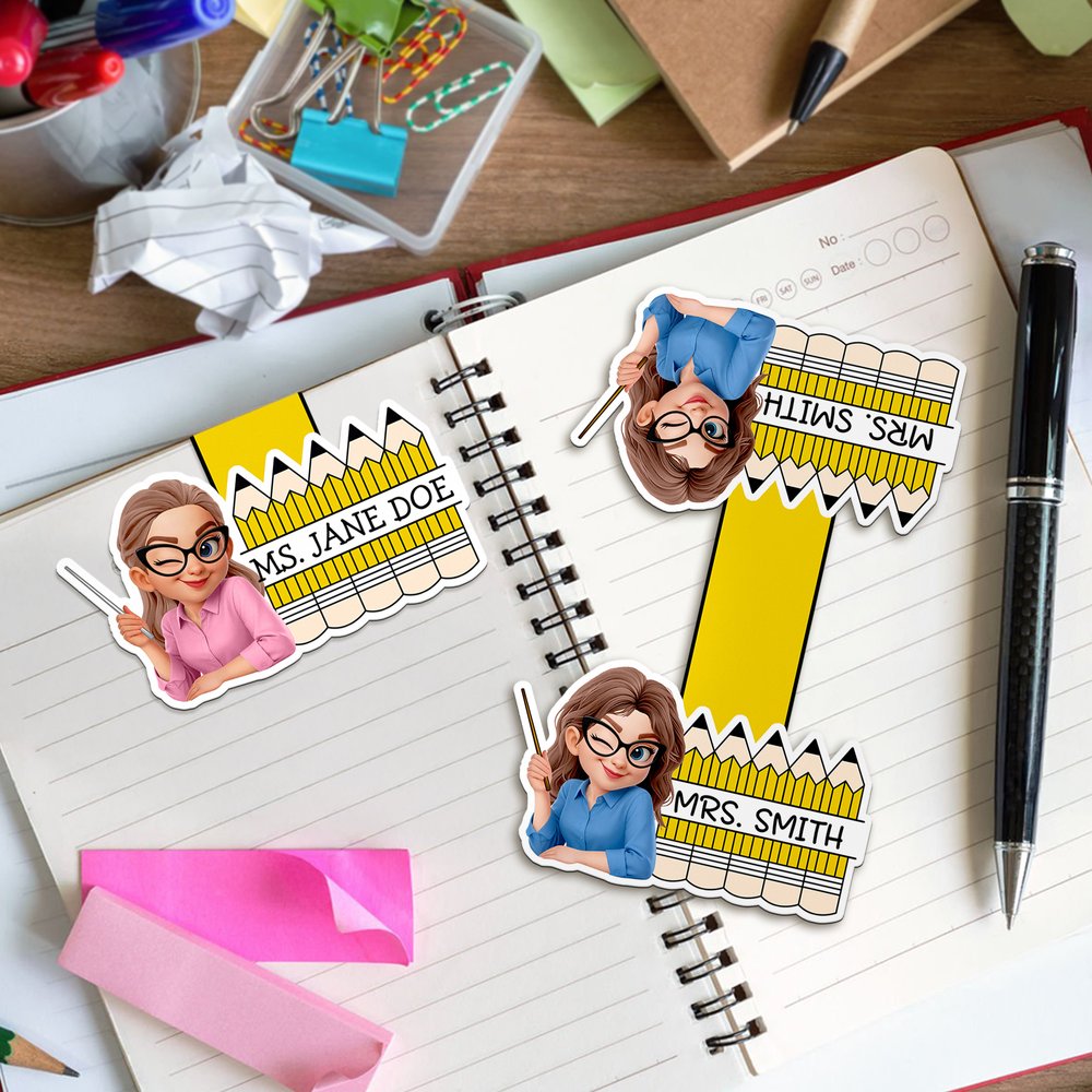 Featuring a cartoon image of a female teacher, pencil elements, and a personalized title, this bookmark exudes a warm and comforting style, conveying respect and a sense of exclusivity. It combines aesthetic appeal with lasting commemorative value.