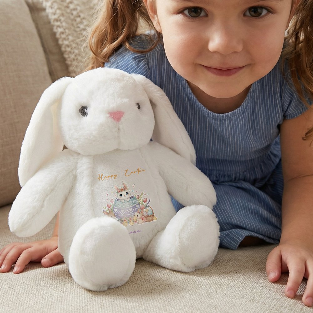 This rabbit plush toy is inspired by fresh watercolor art, featuring a spring rabbit pattern on its chest – cute bunnies nestled among flowers and colorful eggs, like a flowing pastoral painting. Custom name design is available, making each rabbit a unique work of art that carries heartfelt meaning.