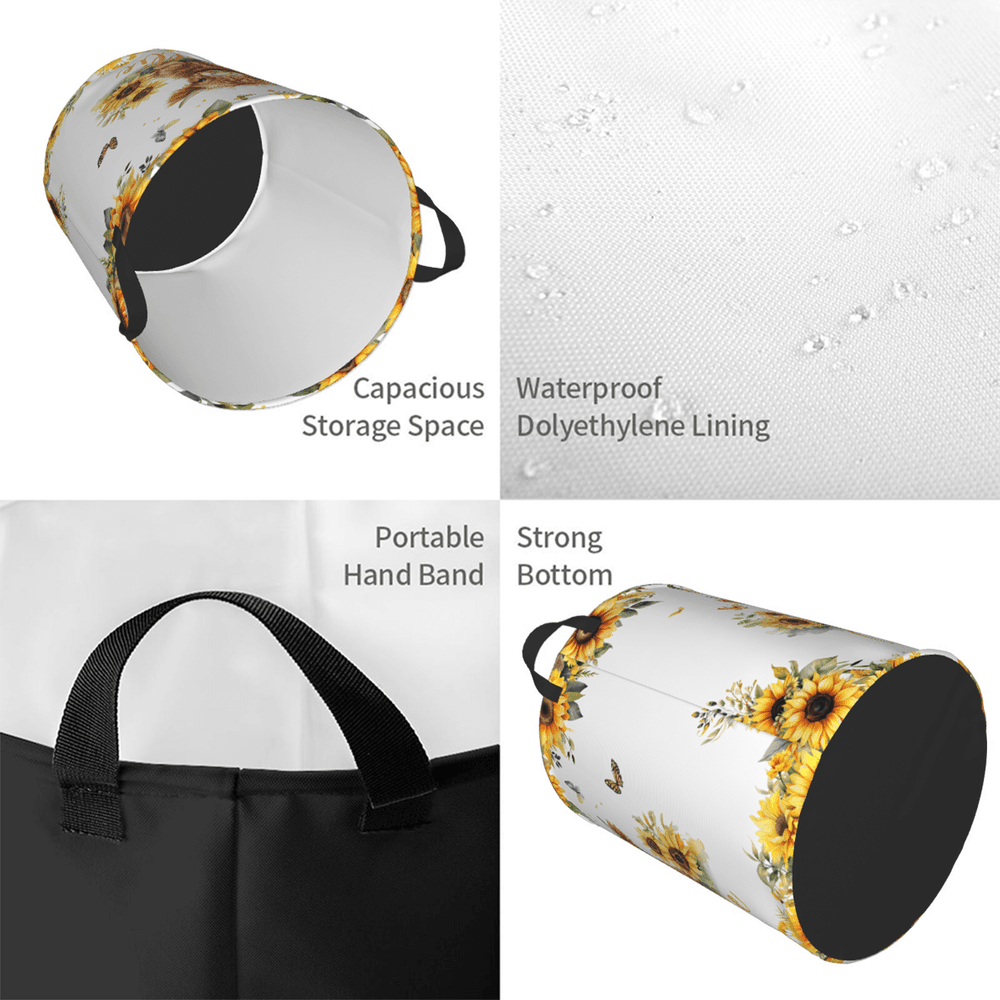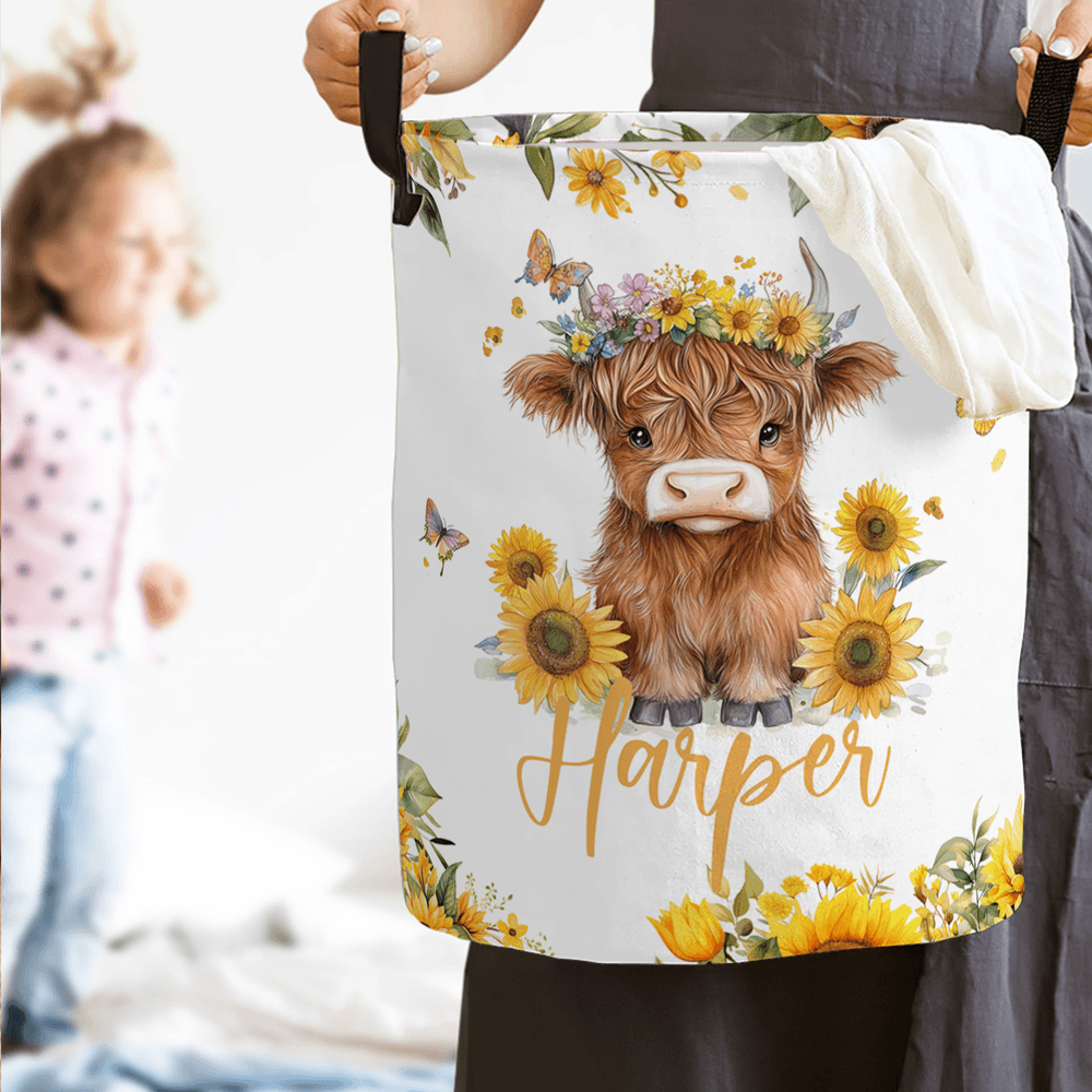 Personalized Cute Sunflower Highland Cow Large Waterproof Storage Laundry Basket with Name and Handle Daily Use Birthday Gift for Kids