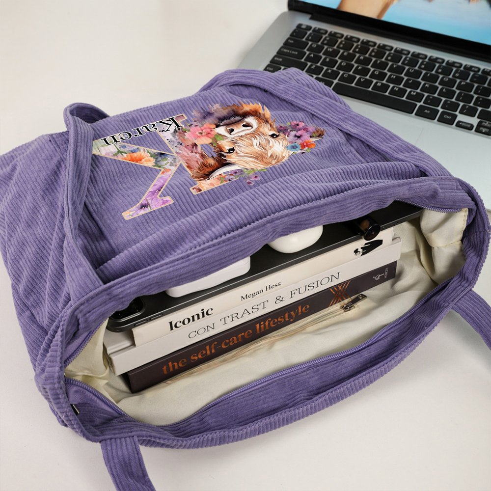 The tote bag boasts a warm, rustic aesthetic with a playful Highland cow illustration paired with delicate floral accents and a custom initial. The overall style is casual yet whimsical, blending pastoral charm with modern functionality, making it a stylish statement piece that elevates any everyday outfit while showcasing the wearer’s unique taste.