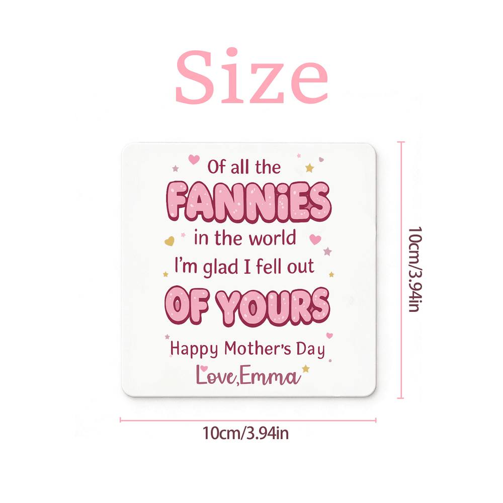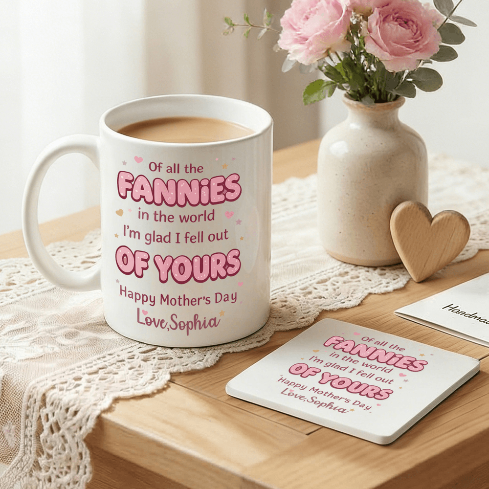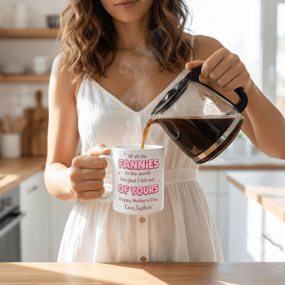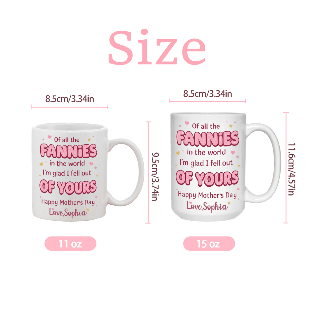 This charming mug features a hilarious and heartwarming quote—“Of all the FANNIES in the world, I’m glad I fell out of YOURS”—paired with playful typography and tiny heart accents. Fully customizable, you can add your child’s name or a special message at the bottom, turning a simple coffee cup into a hilarious and loving tribute that celebrates your unique mother-child bond.