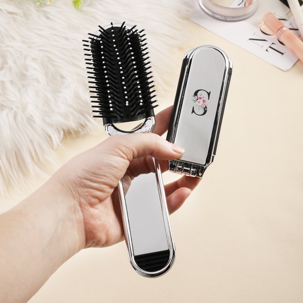 Personalized Stylish Floral Portable 2-In-1 Foldable Makeup Mirror Hair Brush with Initial Daily Use Mother's Day Birthday Gift for Women Girls